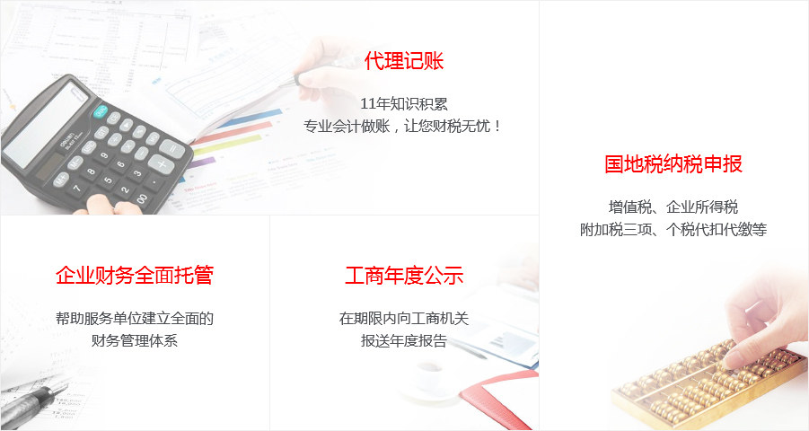 業(yè)務(wù)涉及:代辦各種營(yíng)業(yè)執(zhí)照(商貿(mào)型、服務(wù)型、科技型、實(shí)業(yè)型企業(yè)等)及會(huì)計(jì)記賬(建賬建制、稅收籌劃、納稅申報(bào)、整理舊帳、所得稅匯算等)等咨詢(xún);我公司以誠(chéng)信為本,期待與您真誠(chéng)合作!